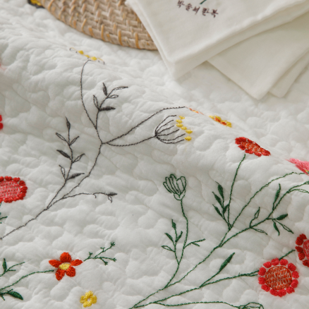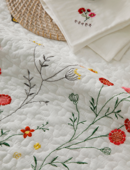 I put the flower embroidery of hanbok, a traditional Korean dress, in my bedding